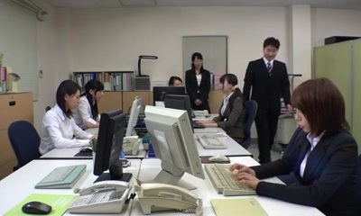 Japanese chick wearing lingerie having clothed lovemaking with her coworker
