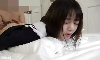 18-year-old black-haired Japanese sweetheart. She has a blowjob and a beautiful smoothly-shaven pussy and creampie sex. Uncensored
