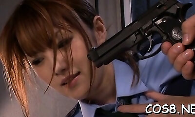 Sexy Japanese in uniform topped up in her hairy muff hole